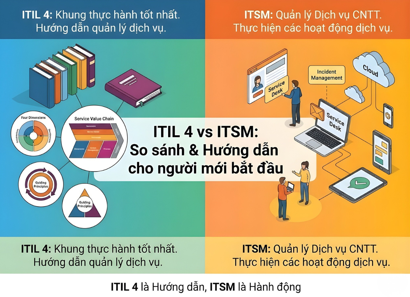 Nhiều người làm IT Support/Helpdesk/Operations nghe “ITSM” và “ITIL 4” rất nhiều, nhưng dễ nhầm là một. Thực ra, hai khái niệm này liên quan