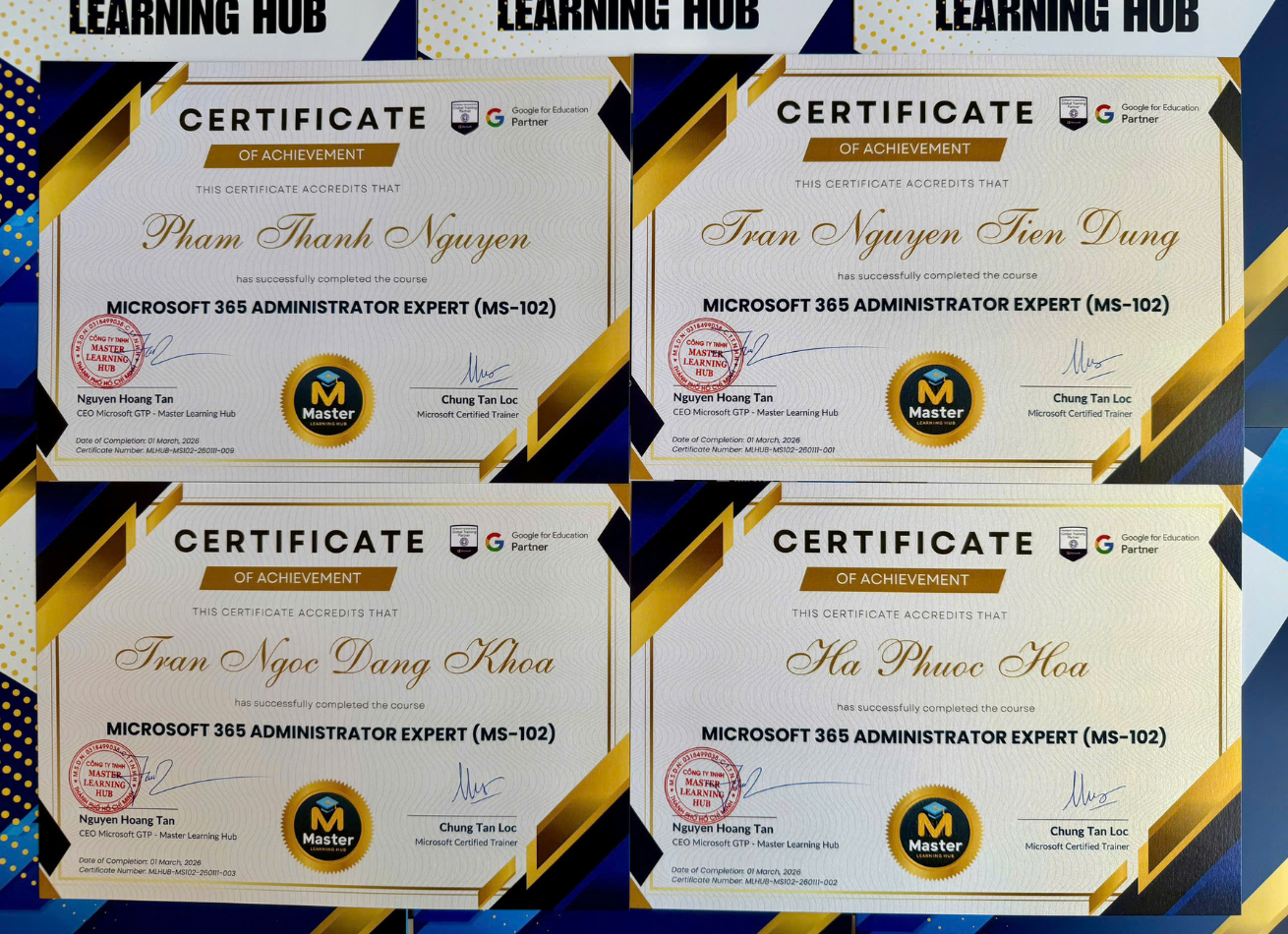Master Learning Hub Academy xin chúc mừng các anh chị đã xuất sắc hoàn thành khóa học “Microsoft 365 Administrator (MS-102)” – KG: 11/01/2026 Chúng