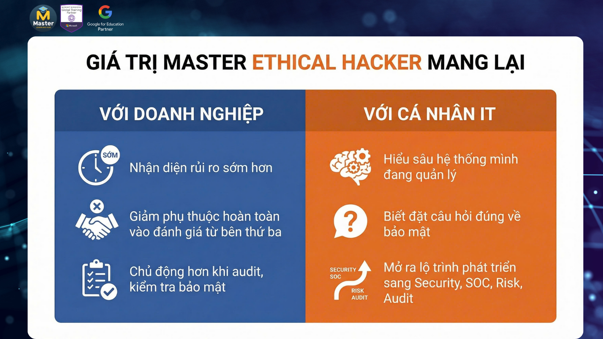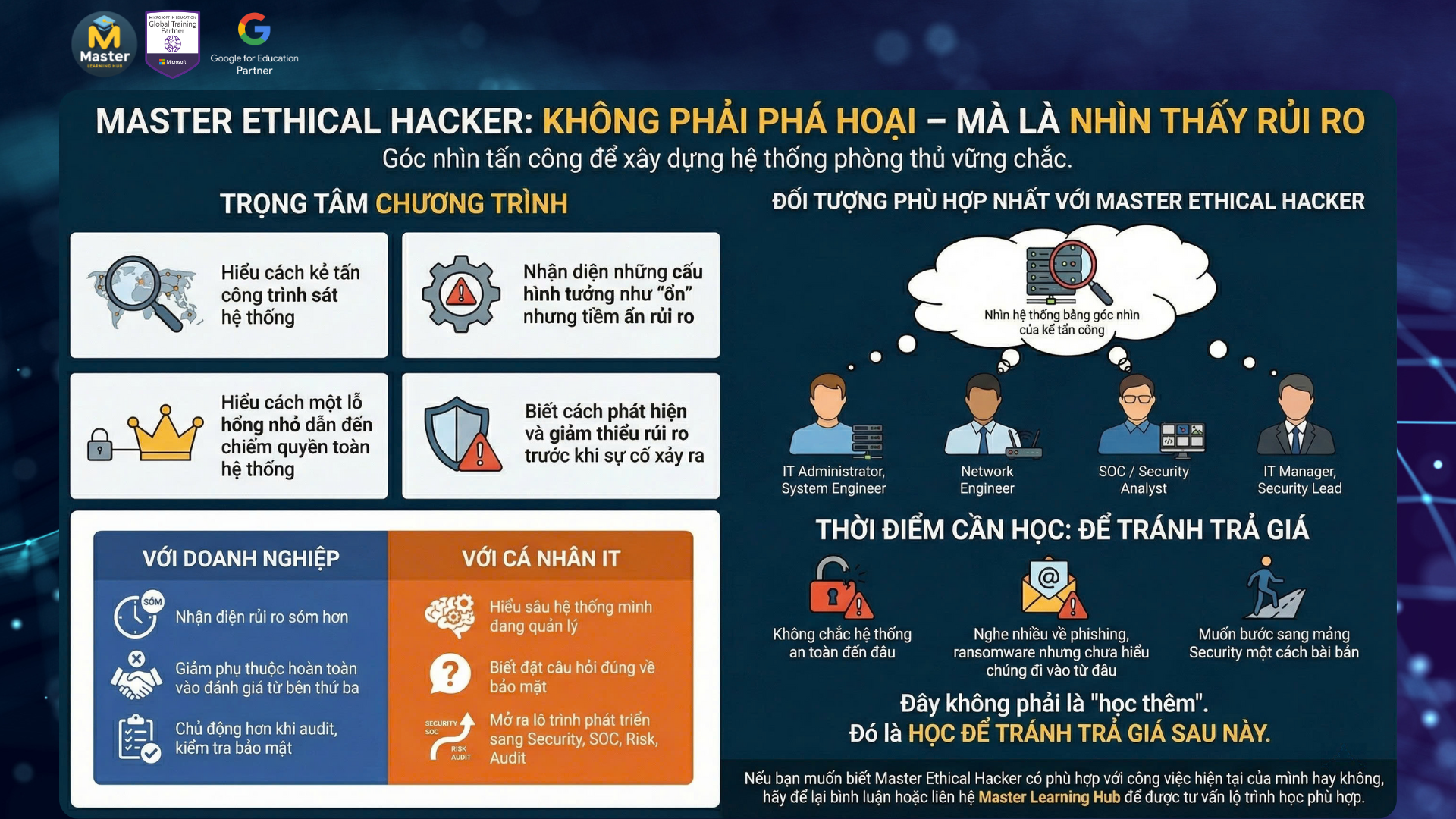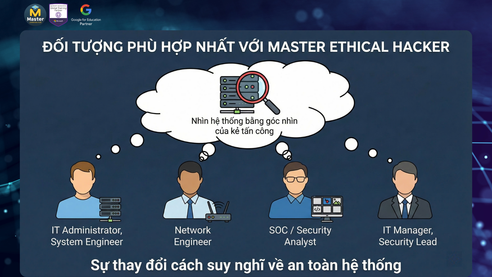 Điểm chung của họ là đang quản lý hệ thống thật, nhưng chưa từng nhìn hệ thống bằng góc nhìn của kẻ tấn công. Với những đối tượng này, Master Ethical Hacker không đơn thuần là một khóa học. Đó là sự thay đổi cách suy nghĩ về an toàn hệ thống.