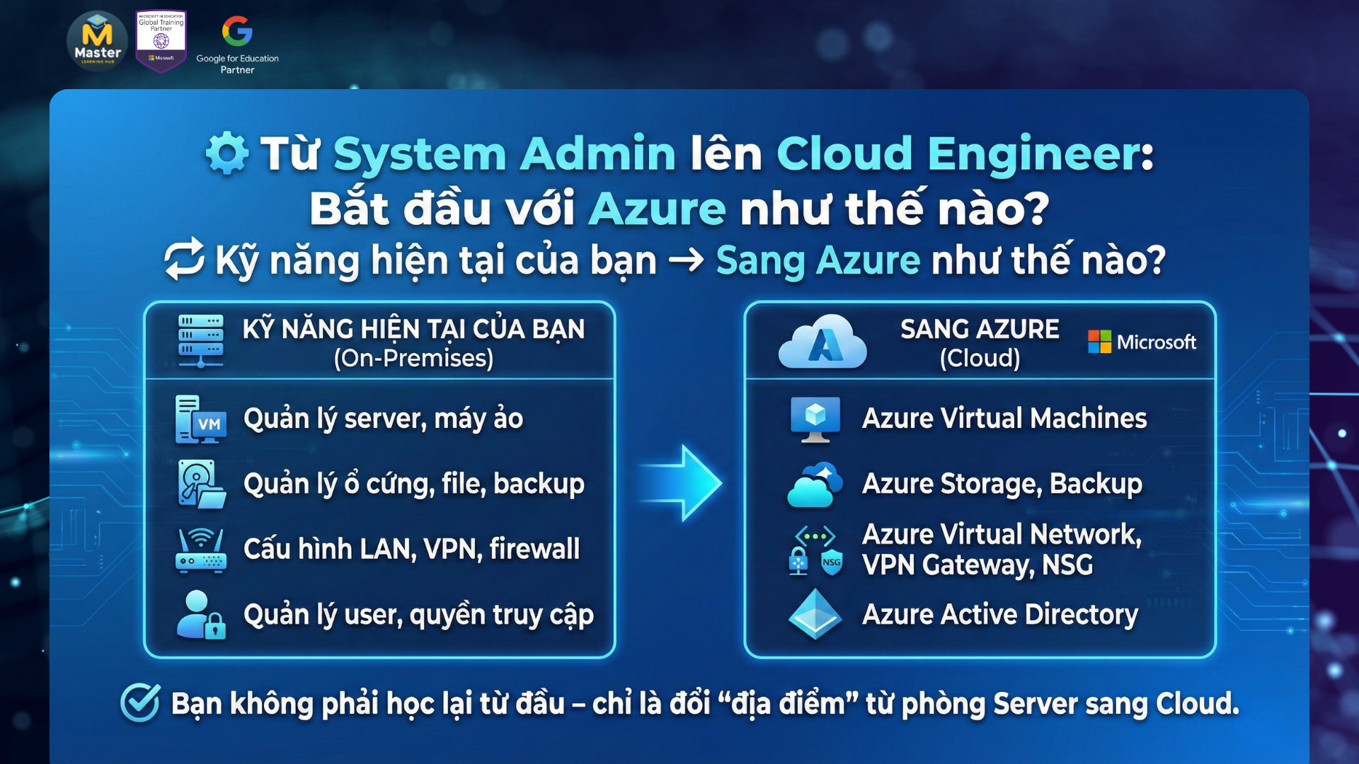 Nhưng thực tế, bạn đã có nền tảng rất tốt. Điều bạn cần là học Azure theo đúng lộ trình để chuyển đổi mượt hơn, không bị hổng kiến thức.