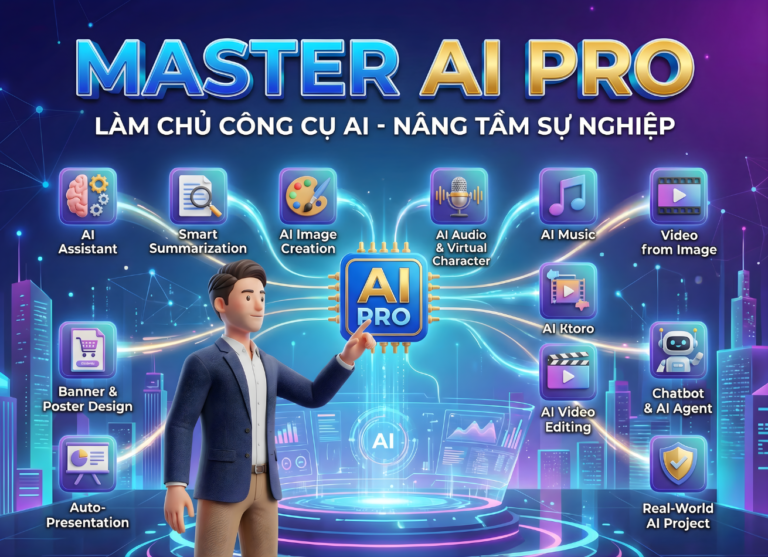 Khóa học “Master AI Pro” của Master Learning Hub Academy được thiết kế nhằm giúp học viên làm chủ AI theo cách đơn giản, thực tế và dễ áp dụng, kể cả khi chưa có nền tảng kỹ thuật. Thay vì học rời rạc từng công cụ, học viên được dẫn dắt theo một lộ trình xuyên suốt: từ tư duy làm việc với AI, xử lý thông tin, sáng tạo hình ảnh – video – âm thanh, cho đến xây dựng chatbot, nhân viên bán hàng ảo, ứng dụng và website mà không cần viết code.