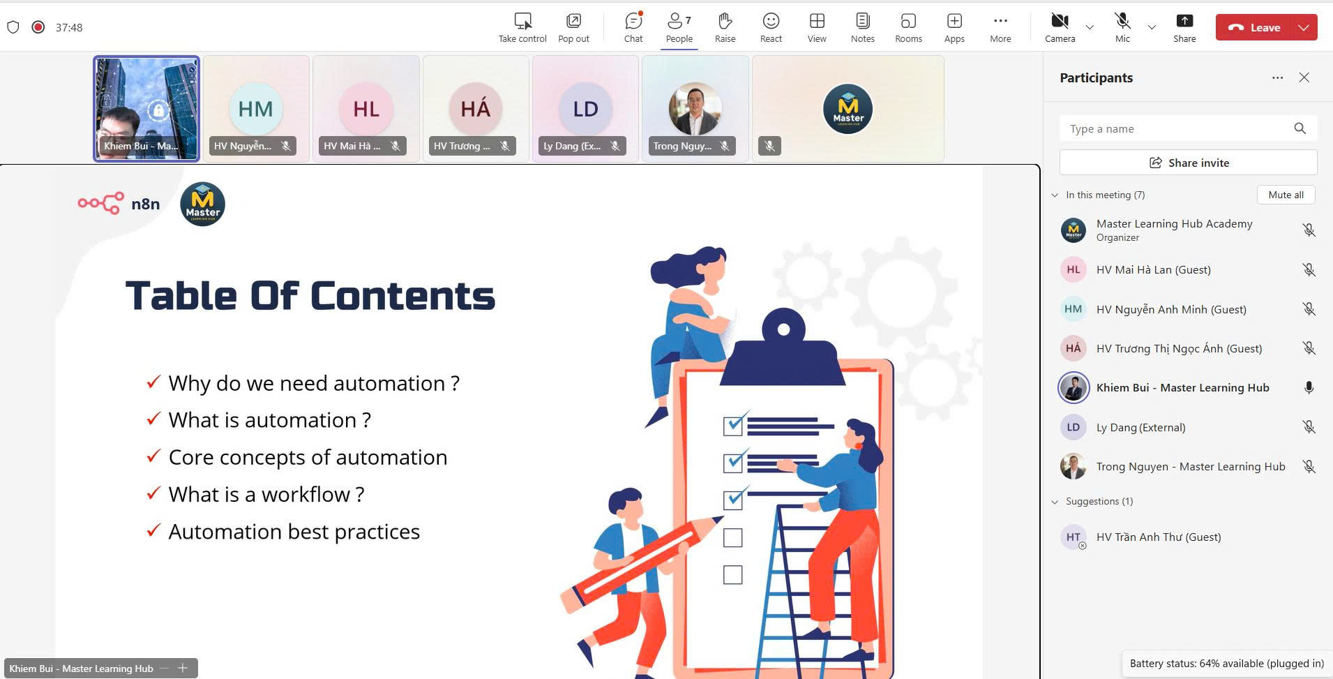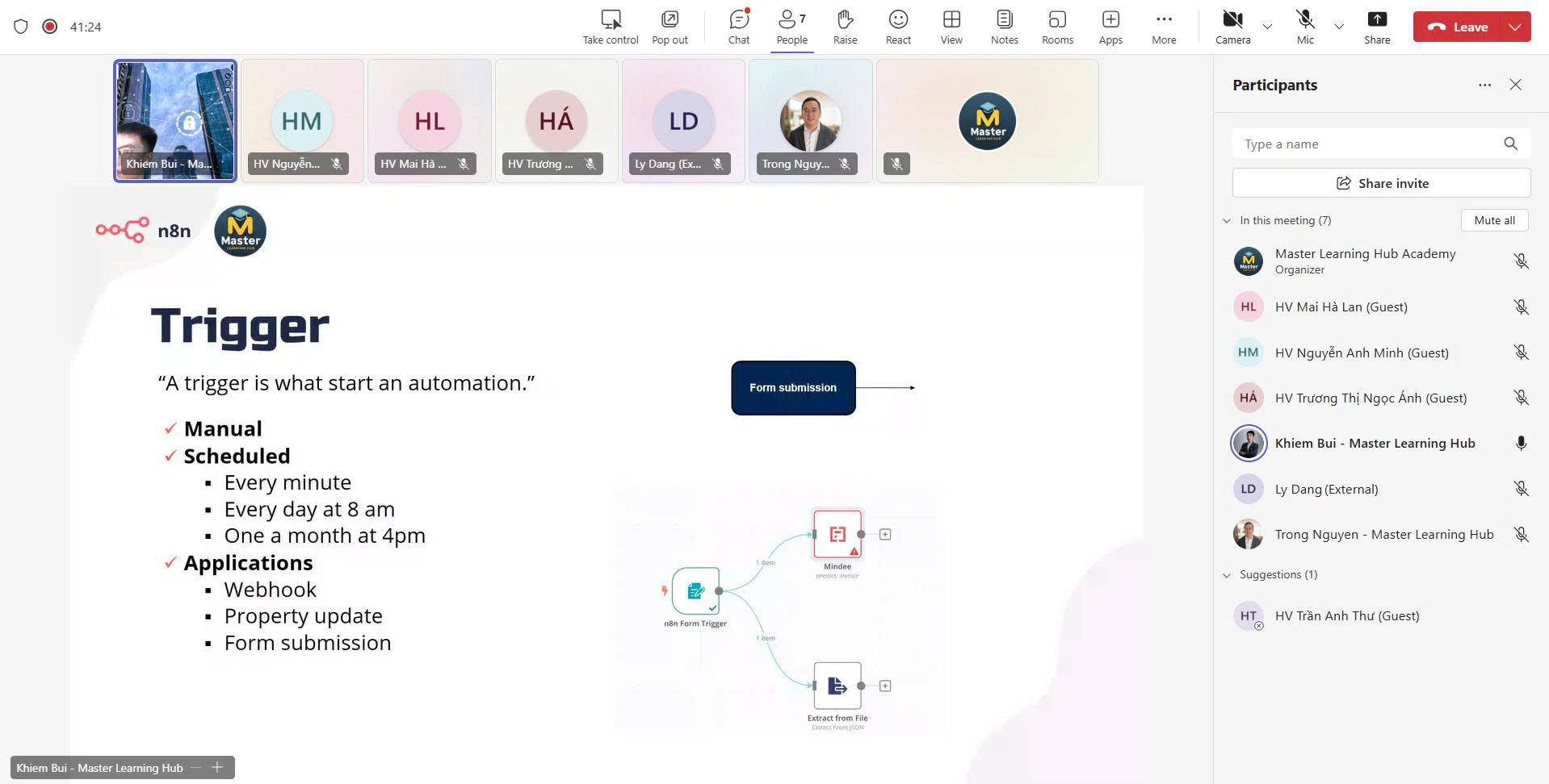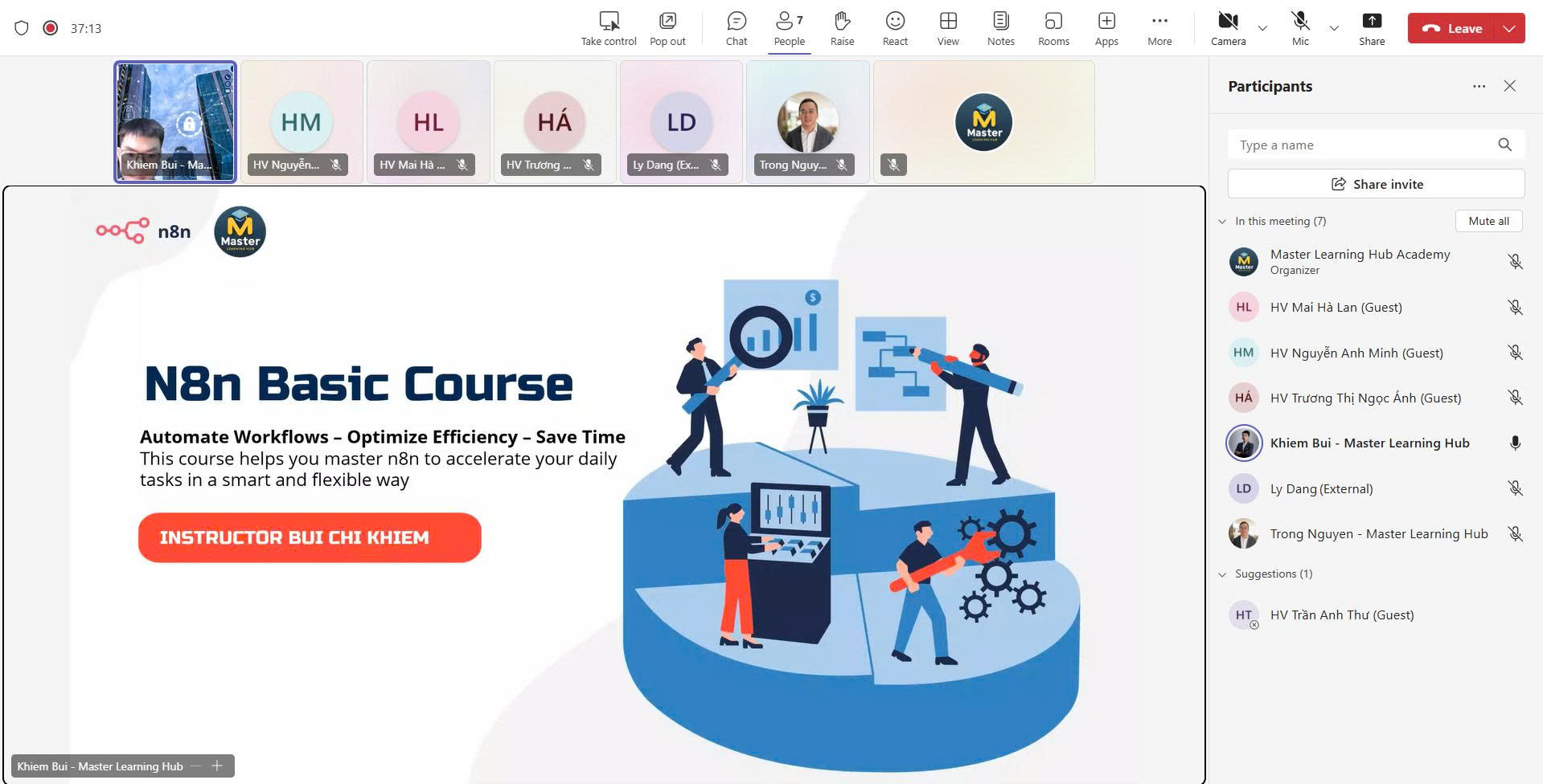 Vào ngày 20/09/2025, Master Learning Hub Academy đã khai giảng thành công lớp N8N Basic Automation – Tự động hóa cơ bản. Khóa học được dẫn dắt bởi đội ngũ giảng viên giàu kinh nghiệm, với kiến thức chuyên sâu trong lĩnh vực tự động hóa quy trình công việc và ứng dụng thực tế trong doanh nghiệp.