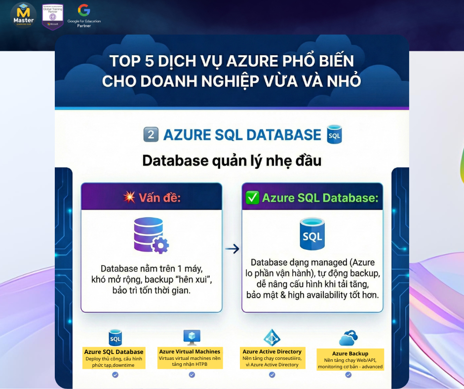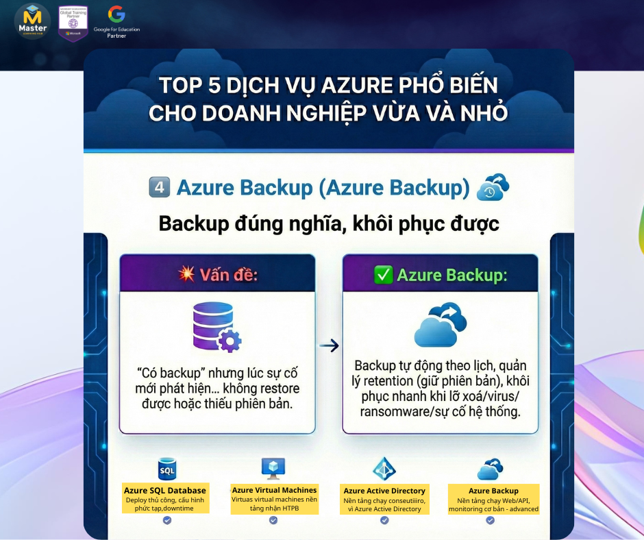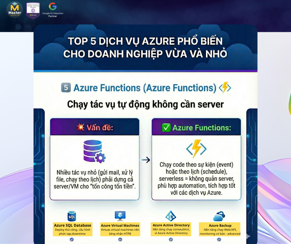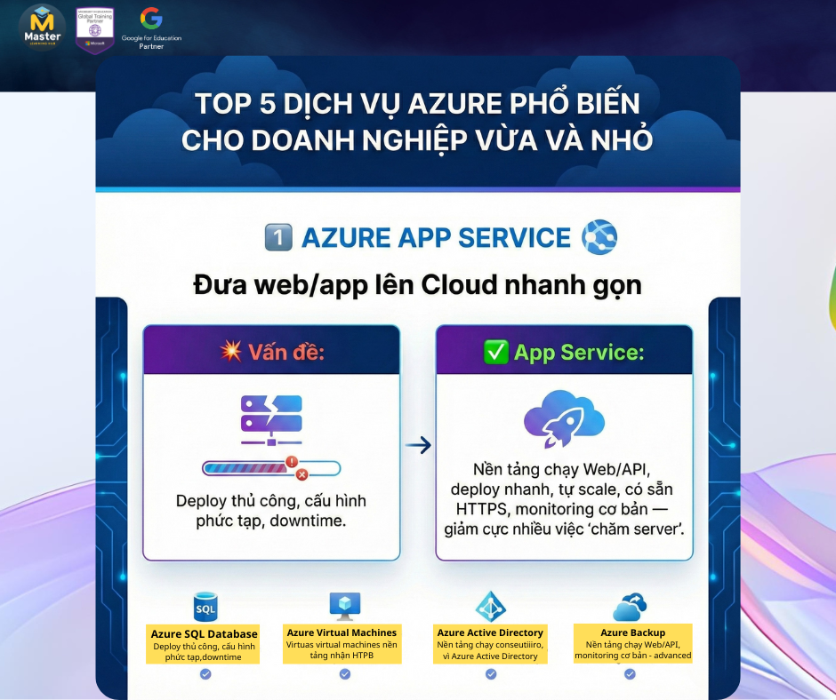 Nhiều doanh nghiệp bắt đầu “lên Cloud với Azure” thường không biết nên dùng dịch vụ nào trước. Thực tế, phần lớn nhu cầu của doanh nghiệp vừa và nhỏ xoay quanh 5 nhóm: chạy ứng dụng, database, quản lý danh tính, backup và tự động hóa.